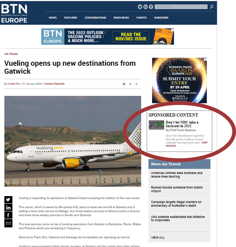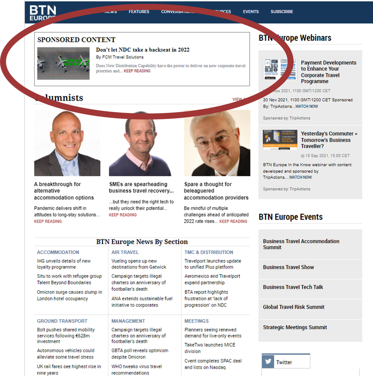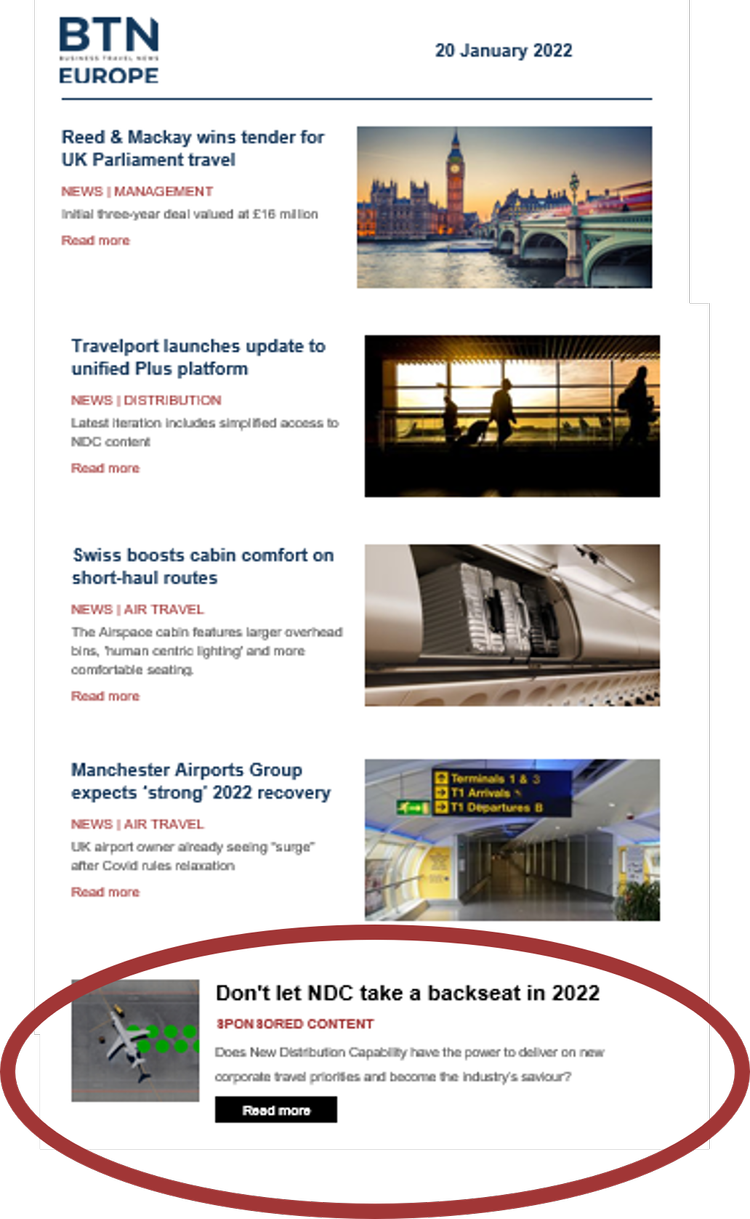 Business Travel News Europe sponsored content advertising solutions integrates natively, so it seamlessly mixes with the news, features and analysis delivered in the weekly e-newsletters sent to 14,000+ subscribers and across the website.